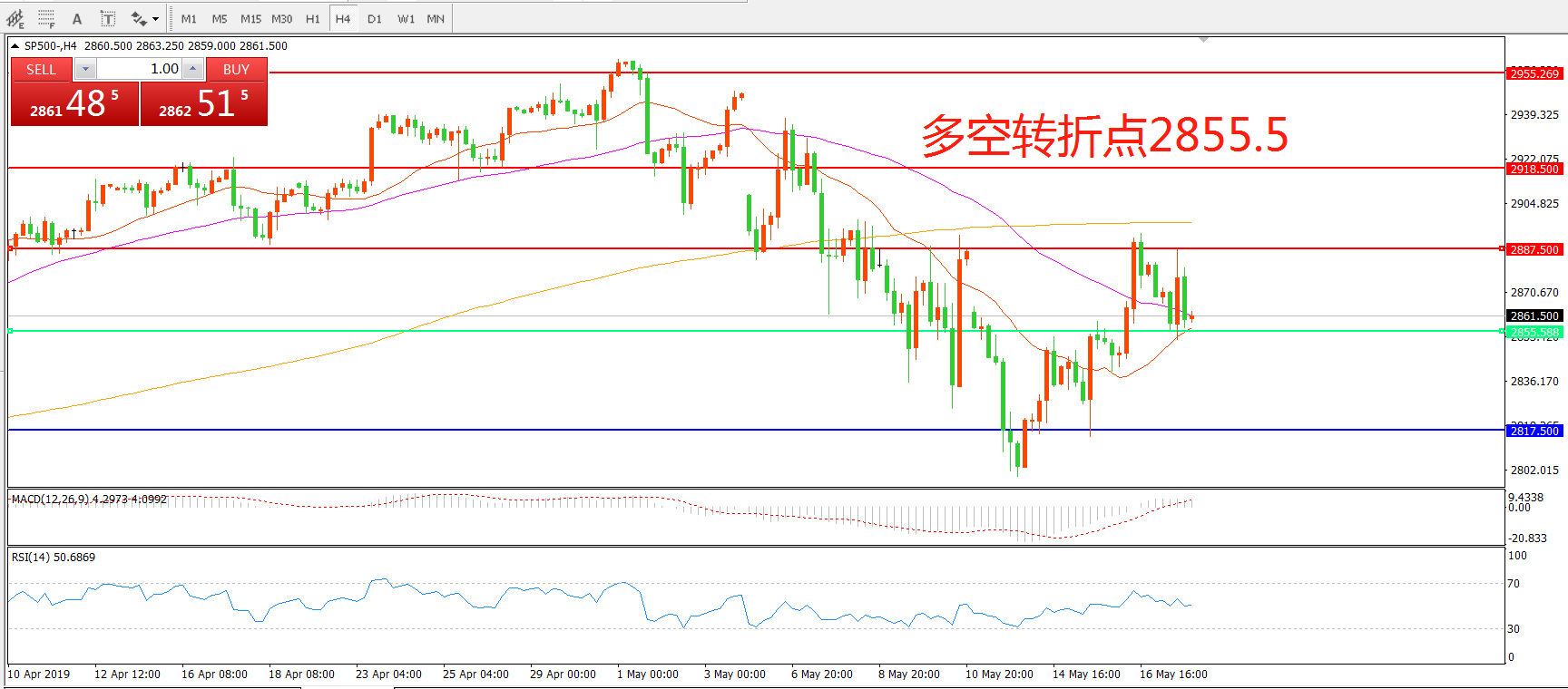 4小时图看,标普500阳整体呈现宽幅震荡形态,上方2887.5成为短期阻力,但下方低点逐渐抬高,21均线有上穿形成金叉迹象,但 MACD绿柱增加, RSI指标走平,日内重点关注2887.5一线得失。
