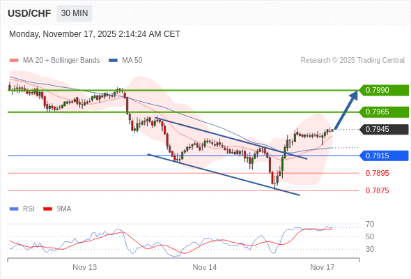 在 0.7915 之上,看涨,目标价位为 0.7965 ,然后为 0.7990 。