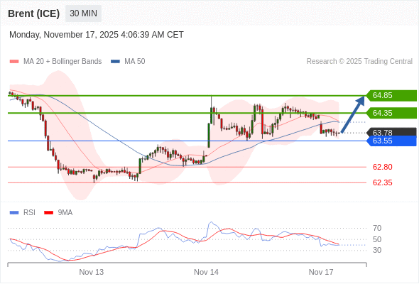 在 63.55 之上,看涨,目标价位为 64.35 ,然后为 64.85 。