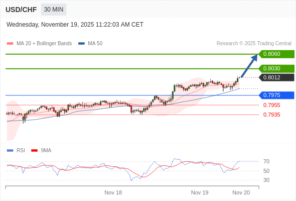在 0.7975 之上,看涨,目标价位为 0.8030 ,然后为 0.8060 。