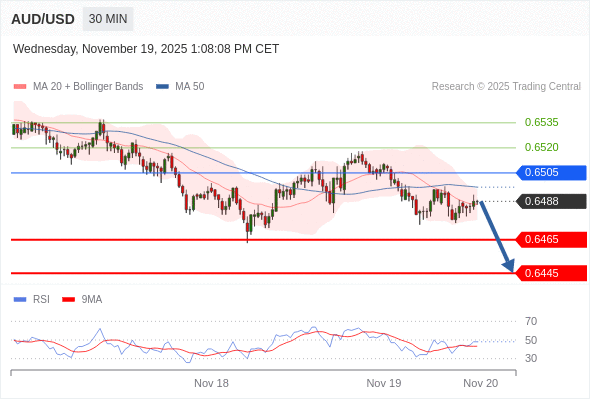 在 0.6505 之下,看跌,目标价位为 0.6465 ,然后为 0.6445 。