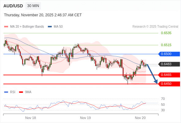 在 0.6500 之下,看跌,目标价位为 0.6465 ,然后为 0.6450 。