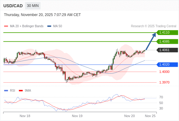 在 1.4020 之上,看涨,目标价位为 1.4085 ,然后为 1.4110 。