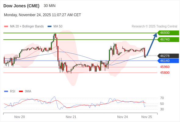 在 46140 之上,看涨,目标价位为 46740 ,然后为 46930 。