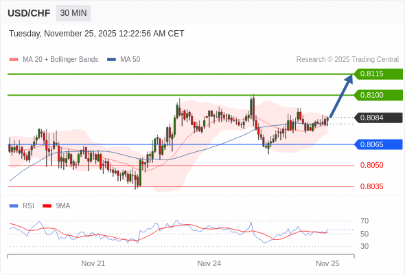 在 0.8065 之上,看涨,目标价位为 0.8100 ,然后为 0.8115 。