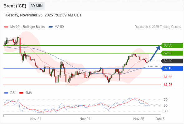 在 62.10 之上,看涨,目标价位为 62.90 ,然后为 63.30 。