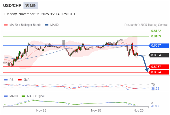 美元/瑞郎 当日内 : 看跌,在 0.8087 之下。