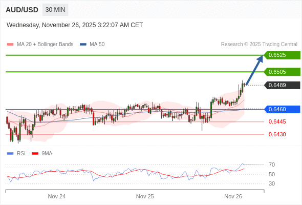在 0.6460 之上,看涨,目标价位为 0.6505 ,然后为 0.6525 。