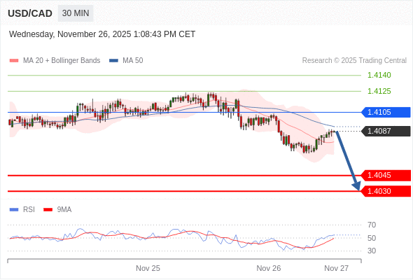 在 1.4105 之下,看跌,目标价位为 1.4045 ,然后为 1.4030 。