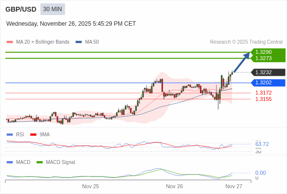 英镑/美元 当日内 : 看涨,当 1.3202 为支撑位。