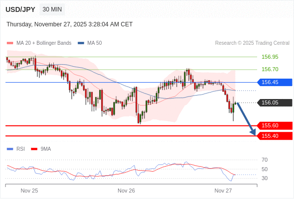 在 156.45 之下,看跌,目标价位为 155.60 ,然后为 155.40 。