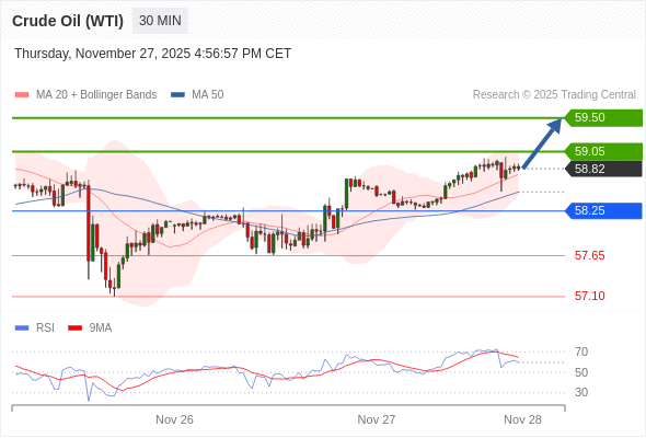 在 58.25 之上,看涨,目标价位为 59.05 ,然后为 59.50 。
