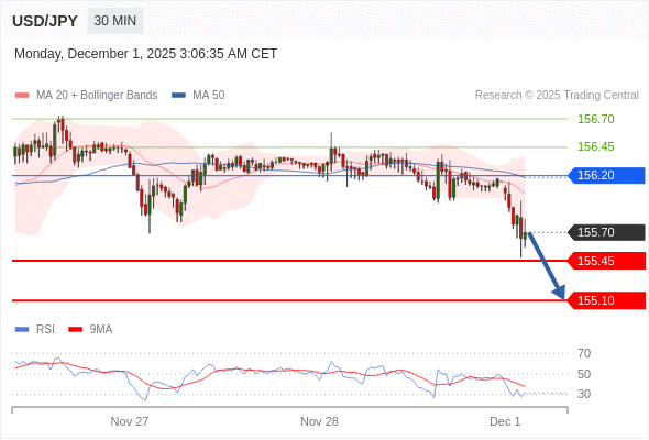 在 156.20 之下,看跌,目标价位为 155.45 ,然后为 155.10 。