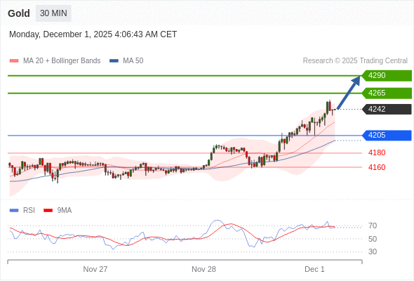 在 4205 之上,看涨,目标价位为 4265 ,然后为 4290 。