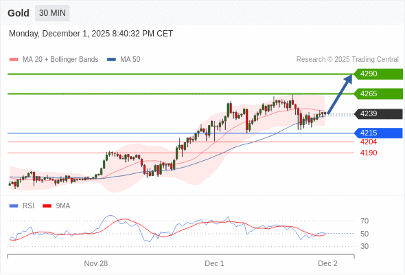 在 4215 之上,看涨,目标价位为 4265 ,然后为 4290 。