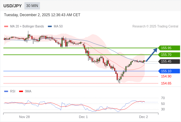 在 155.10 之上,看涨,目标价位为 155.70 ,然后为 155.95 。