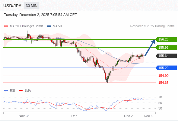 在 155.20 之上,看涨,目标价位为 155.95 ,然后为 156.25 。