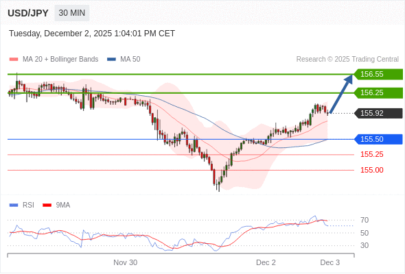 在 155.20 之上,看涨,目标价位为 156.25 ,然后为 156.55 。