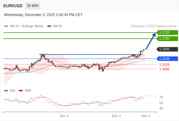 在 1.1634 之上,看涨,目标价位为 1.1700 ,然后为 1.1720 。