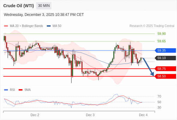 交易策略: 在 59.35 之下,看跌,目标价位为 58.75 ,然后为 58.50 。