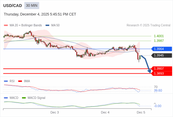美元/加元 当日内 : 看跌,在 1.3964 之下。