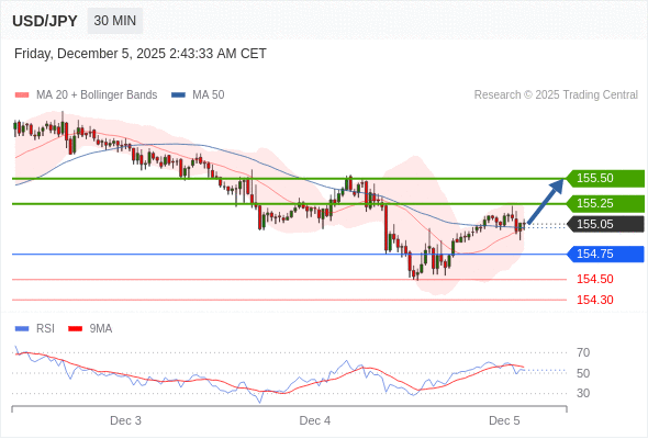 在 154.75 之上,看涨,目标价位为 155.25 ,然后为 155.50 。