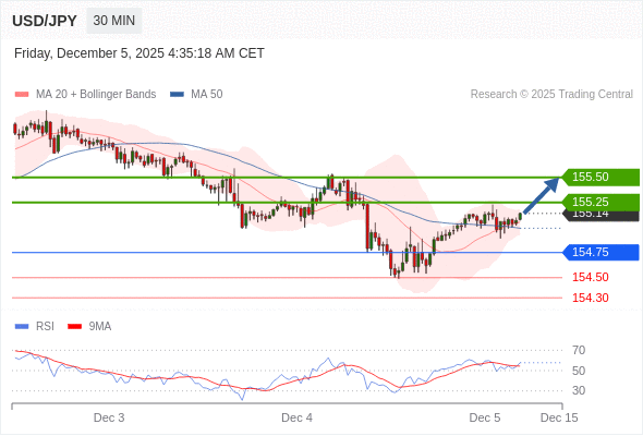 在 154.75 之上,看涨,目标价位为 155.25 ,然后为 155.50 。