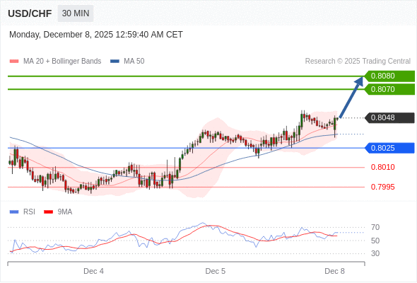 在 0.8025 之上,看涨,目标价位为 0.8070 ,然后为 0.8080 。