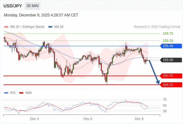 在 155.40 之下,看跌,目标价位为 154.55 ,然后为 154.30 。