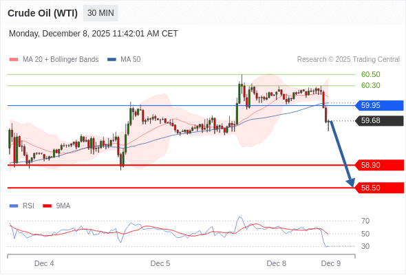 在 59.95 之下,看跌,目标价位为 58.90 ,然后为 58.50 。