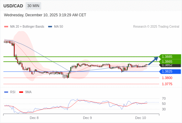 在 1.3825 之上,看涨,目标价位为 1.3865 ,然后为 1.3885 。