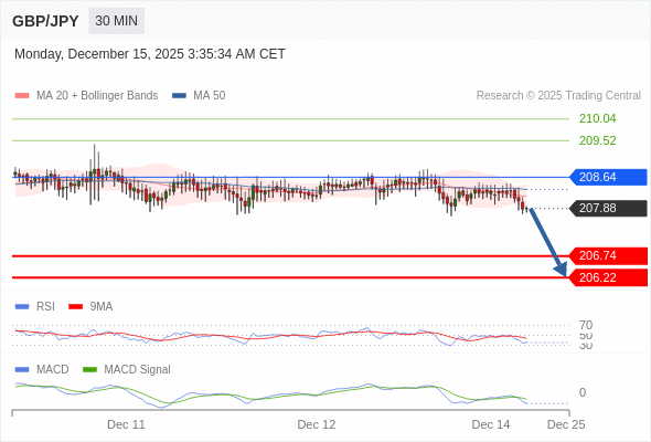 英镑/日元 当日内: 看跌,在 208.64 之下。