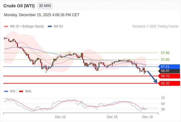 在 57.21 之下,看跌,目标价位为 56.70 ,然后为 56.30 。