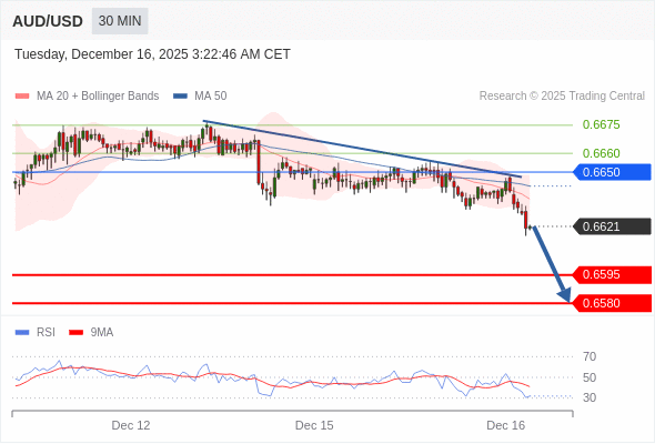 在 0.6650 之下,看跌,目标价位为 0.6595 ,然后为 0.6580 。