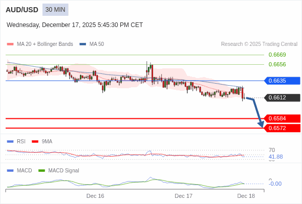 澳元/美元 当日内 : 看跌,在 0.6635 之下。