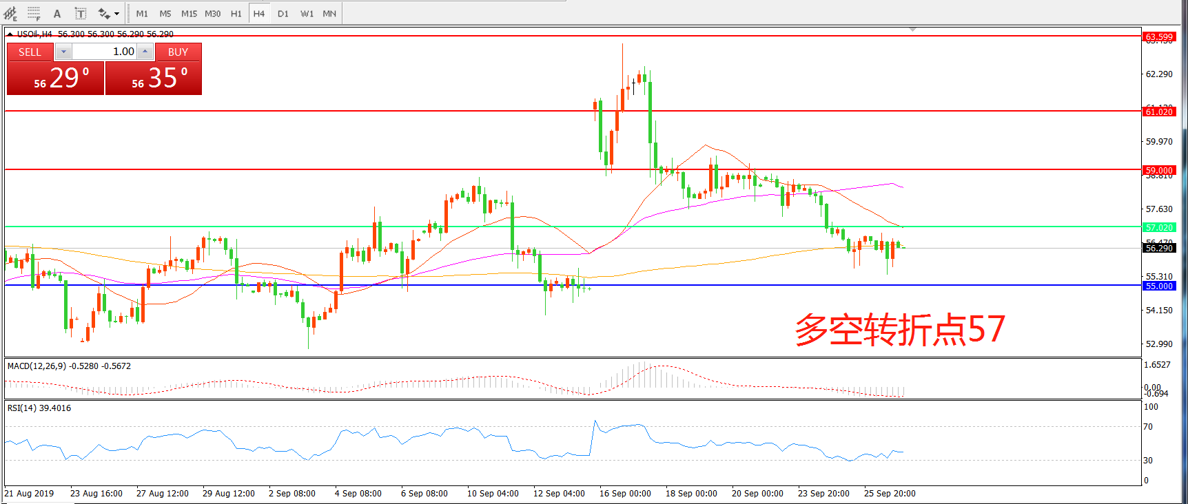 本周油价持续走弱,因在遭遇了有史以来最大规模的石油设施攻击后,沙特恢复产量的速度比自我设定的最后期限提前了大约一周,不过市场对沙特的产量恢复持怀疑态度,因此油市走向仍存疑。周四(9月26日) 美国WTI原油昨日震荡收跌0.1%,报56.31美元/桶。