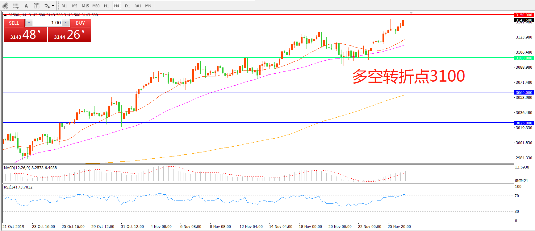 4小时图看,标普500连创新高,多头趋势依然明显,均线系统呈多头排列,MACD红柱增加,RSI指标向上,日内以逢低做多思路为主。