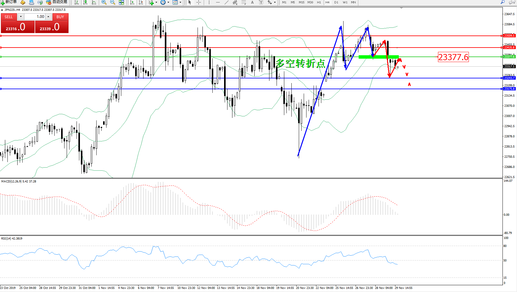 日经225指数11月29日(周五)收盘下跌108.64点,跌幅0.46%,报23300.50点。日本经济产业省29日发布报告说,由于汽车、生产用机械等行业受台风影响减产,10月份经季节调整的工矿业生产指数环比下降4.2%至98.9,降幅大于预期。在全部15个行业中,当月有12个行业生产指数环比下降,其中汽车行业降幅达7.8%,生产用机械行业下降6.4%。数据还显示,10月份工矿业出货指数环比下降4.3%,库存指数环比上升1.2%。有专家分析说,报告显示生产下滑的同时库存上升,这可能与外需下降有关。此外,前期部分中小企业在增税前提前采购,也是影响10月份数据的原因之一。