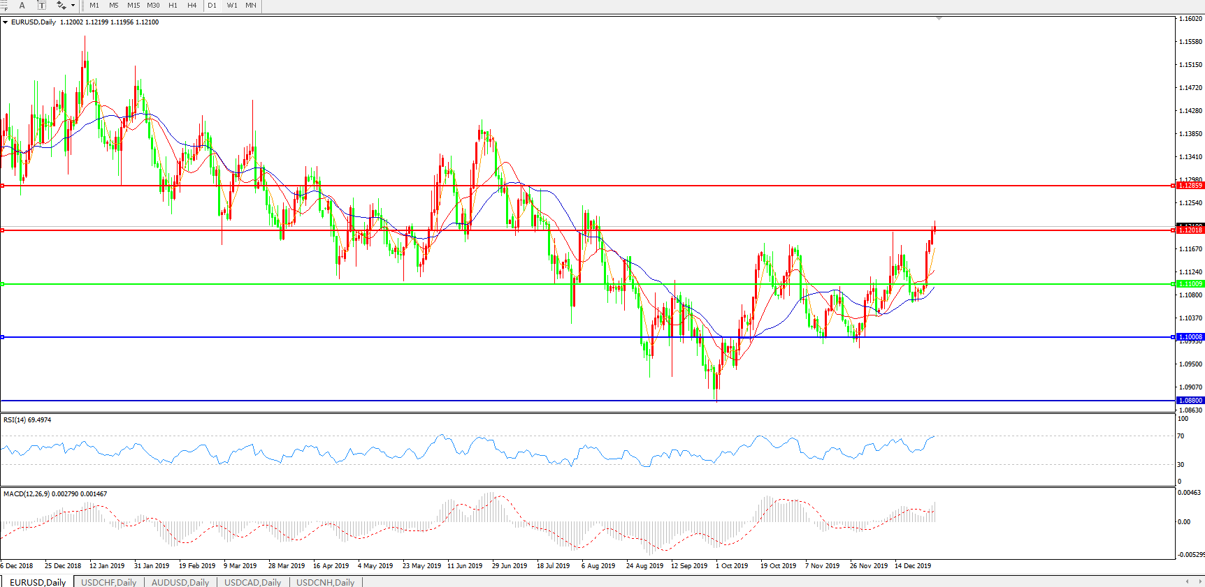 彭博综合定价显示,周一欧元兑美元汇率升至8月以来的最高水平,交叉货币基点互换交易升至历史最高水平。虽然这两个价格都在2018年年末有强劲表现,但这次期权交易员对接下来的几个月走势变得乐观,这和一年前迥然相反;由于美元的持续走强, 欧元在2019年下跌了2%以上,成为表现最差的主要货币之一。尽管如此,由于假日流动性稀少和资金紧张,欧元近几天上涨近1%,达到1.12美元。虽然这可以看作是正常年末的短暂副作用,但其改变了货币的中期前景 欧元-美元基点互换交易在资金紧张的时候往往会更加剧烈地波动,就像在2018年底一样,欧元-美元基点互换价格周一攀升至零以上。今年1月,欧元曾快速跌至零以下,因为其失去了吸引力,而且直到5月底一直承受压力。这次的情况可能有所不同;三个月期风险逆转率表明交易员对欧元的看涨程度达到近两年来最高 ,2018年末他们更倾向于押注欧元下跌。技术图表还表明, 欧元已经牢固确定了向上的中短期前景