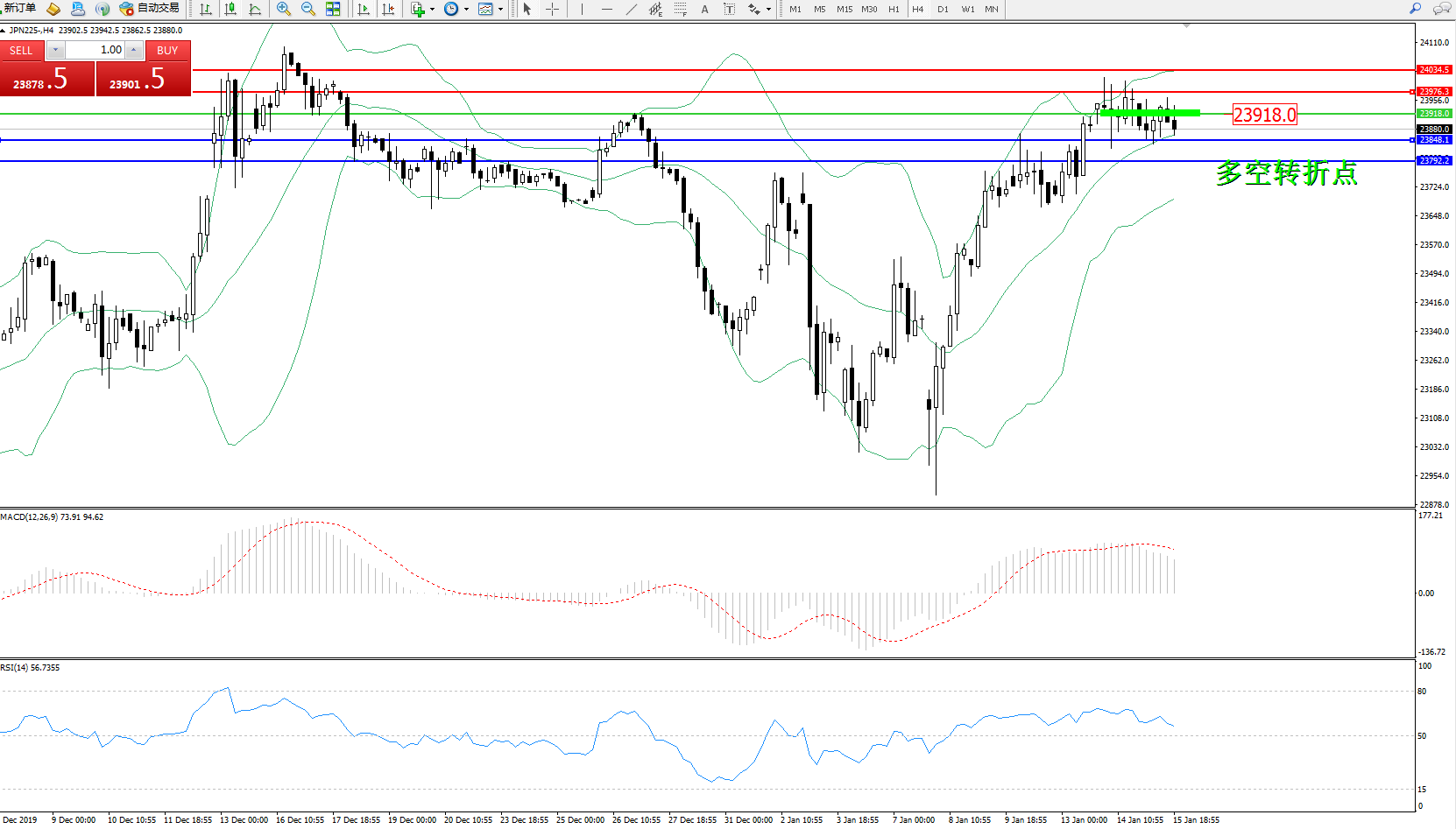 日经225指数115日(周三)收盘下跌124.67点,跌幅0.52%,报23900.50点。日本央行行长黑田东彦:日本经济处于温和扩张趋势中,如果风险上行,央行会毫不犹豫增加宽松措施,如有需要,预计短期和长期利率将维持在当前或更低水平至足够长的时间,消费者通胀将逐渐朝2%加速,因正面产出缺口和通胀预期上升、与此同时会暂受油价下滑影响,为实现2%通胀目标,日本央行将以收益率曲线控制维持量化质化宽松(QQE),日本央行将继续扩大基础货币直到消费者通胀稳定超过2%