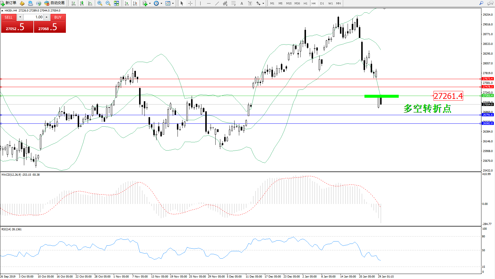 香港恒生指数129日(周三)收盘下跌789.01点,跌幅2.82%,报27160.63点;截至今日收盘,恒指大市成交额为1240.51亿港元(上一交易日成交额为473.22亿港元),港股开年首日大跌,受肺炎疫情影响,港股开年首日大跌。此次肺炎疫情冲击着各大行业,旅游、影视、博彩等皆受其影响。今日皆反应在股票市场上,市场全日低迷,盘中虽略有回升,但始终保持大跌。从板块表现看,系统软件、阿里概念逆势领涨,医疗保健、生物科技走强,香港零售股跌幅最大,影视娱乐、奢侈品、濠赌股、纷纷大跌。个股方面,腾讯盘中一度升逾1%,收跌0.67%;恒隆地产大跌6.67%领跌恒指;医药股普遍强势,山东新华制药逆市飙升近28%,阿里健康大涨超9%,平安好医生、白云山皆走强;生物科技股金斯瑞生物生超4%;在线教育股新东方在线升超7%