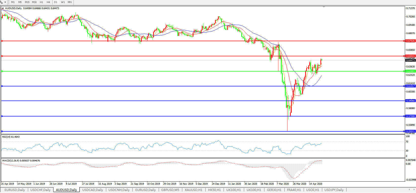 澳元兑美元在周一亚市跳涨1.5%,升至一个半月新高之后,陷入高位盘整,市场正等待更多下一步消息指引;日内推动澳元走强的主要动能一方面在于周末过后消息显示全球疫情进一步趋于缓和,欧洲多国正逐步进入复工复产节奏,这令避险货币重获追捧。与此同时,美元在美联储本周决议前先行承压的走势也推动了非美货币走强;不过澳元短线暂时缺乏一鼓作气继续上行的动能,日内全球市场也暂无更多利多消息推动之,因而澳元汇价仍会在0.65关口面临相当强的阻力。投资者目光已经移向周三的澳洲CPI数据报告,并在此后的美联储决议发布前仍屏息观望。