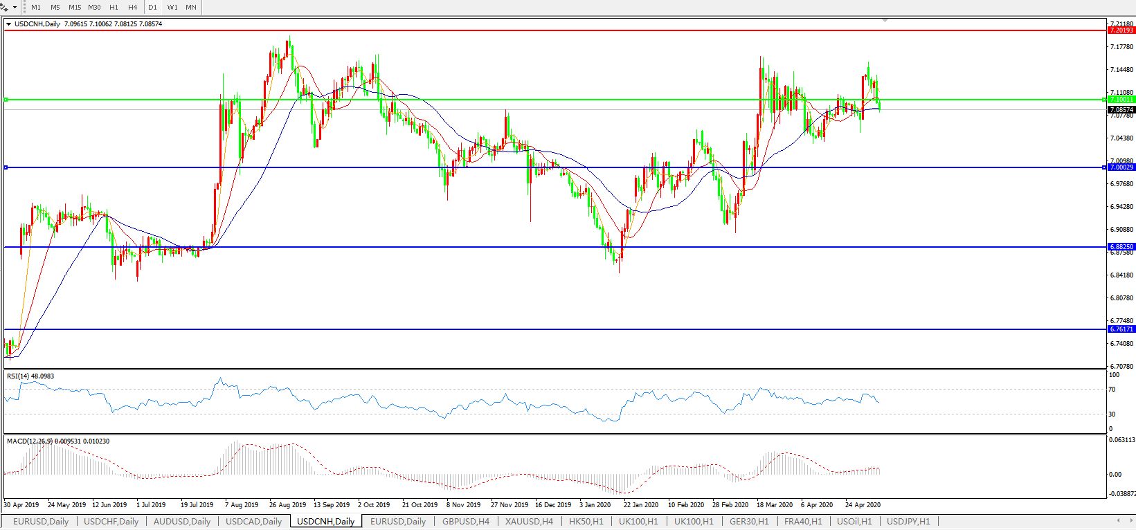 美元兑人民币USDCNH 日线图: