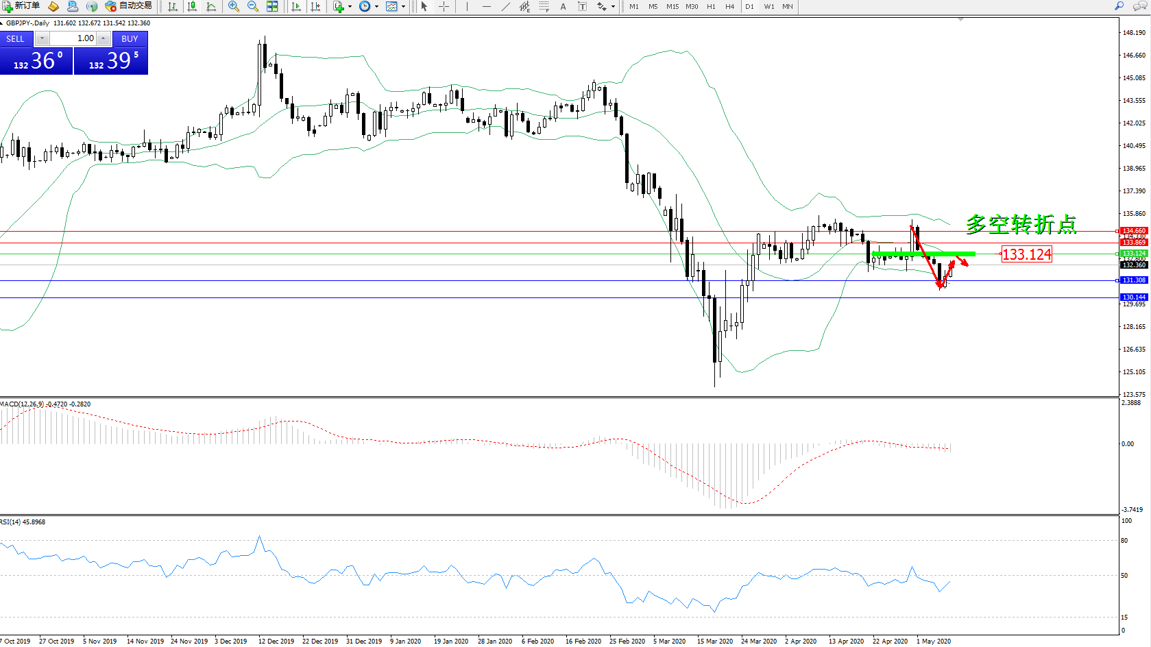 交易策略:133.124下方看跌,目标131.308130.144