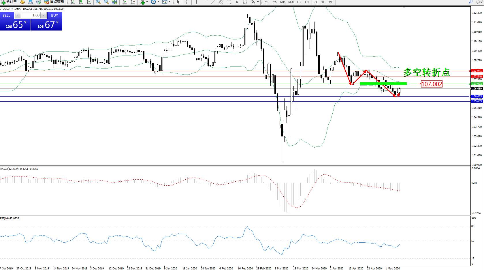 日元连续第二天走势落后由于风险偏好增强及油价上涨,商品货币普遍走高。受投机性空头回补推动,美元兑日元上涨0.35%106.65,周跌幅收窄。日内随着美国好于预期的非农就业数据公布,市场风险偏好情绪转暖,同时美元指数也转升,日元避险需求减少,此外日本多地也正在着手复工复产,加入到全球复工复产中来,日元兑G10货币整体走低。