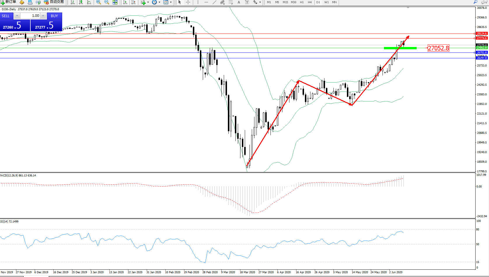 交易策略:27052上方看涨,目标27774、28124