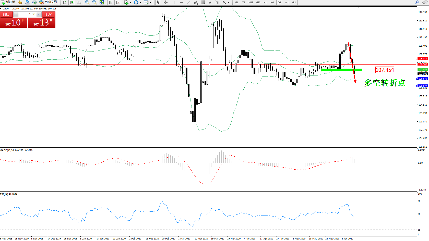 交易策略:107.454下方看跌,目标106.679106.077