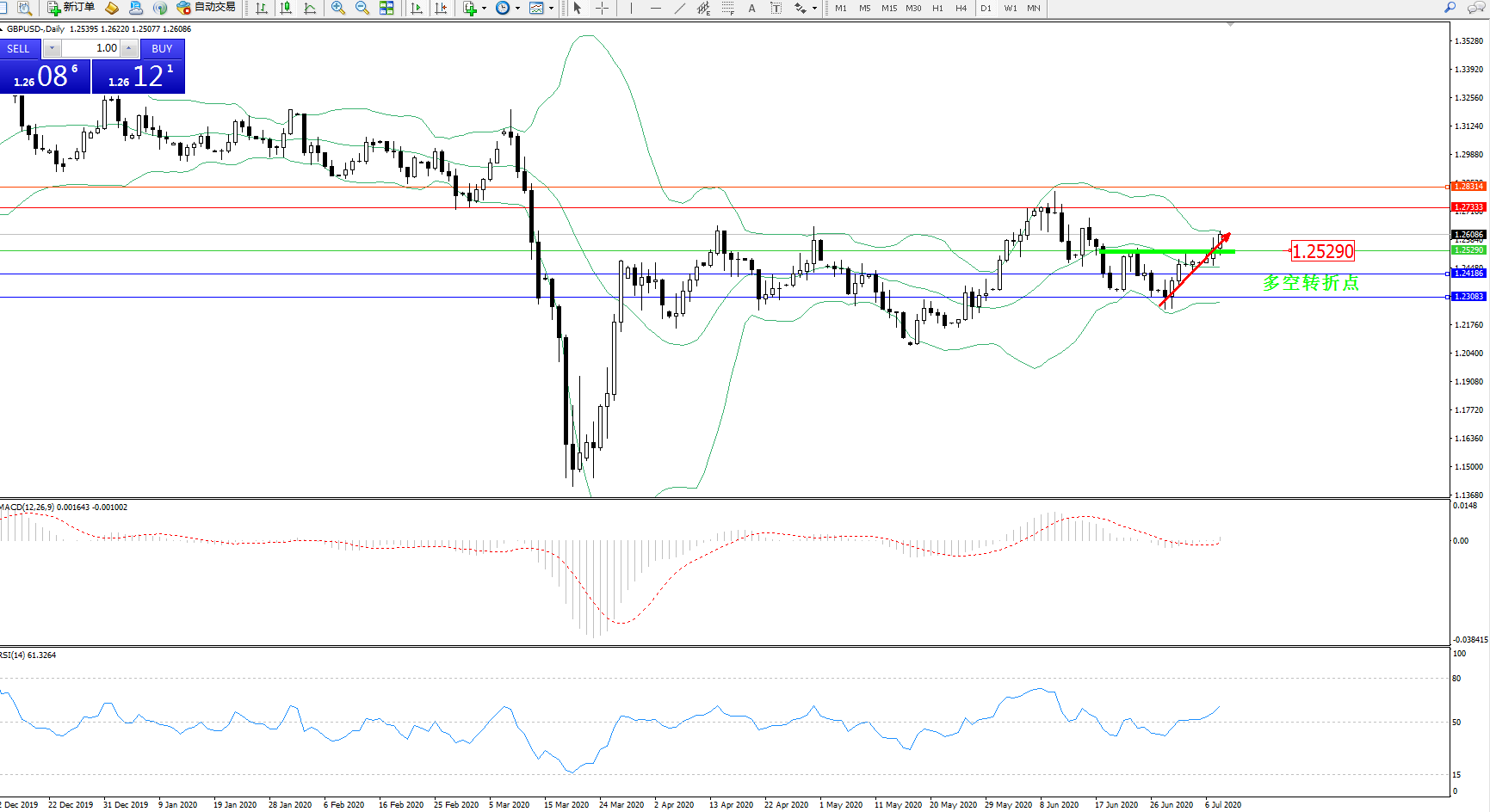 交易策略:1.25290上方看涨,目标1.27333、1.28314