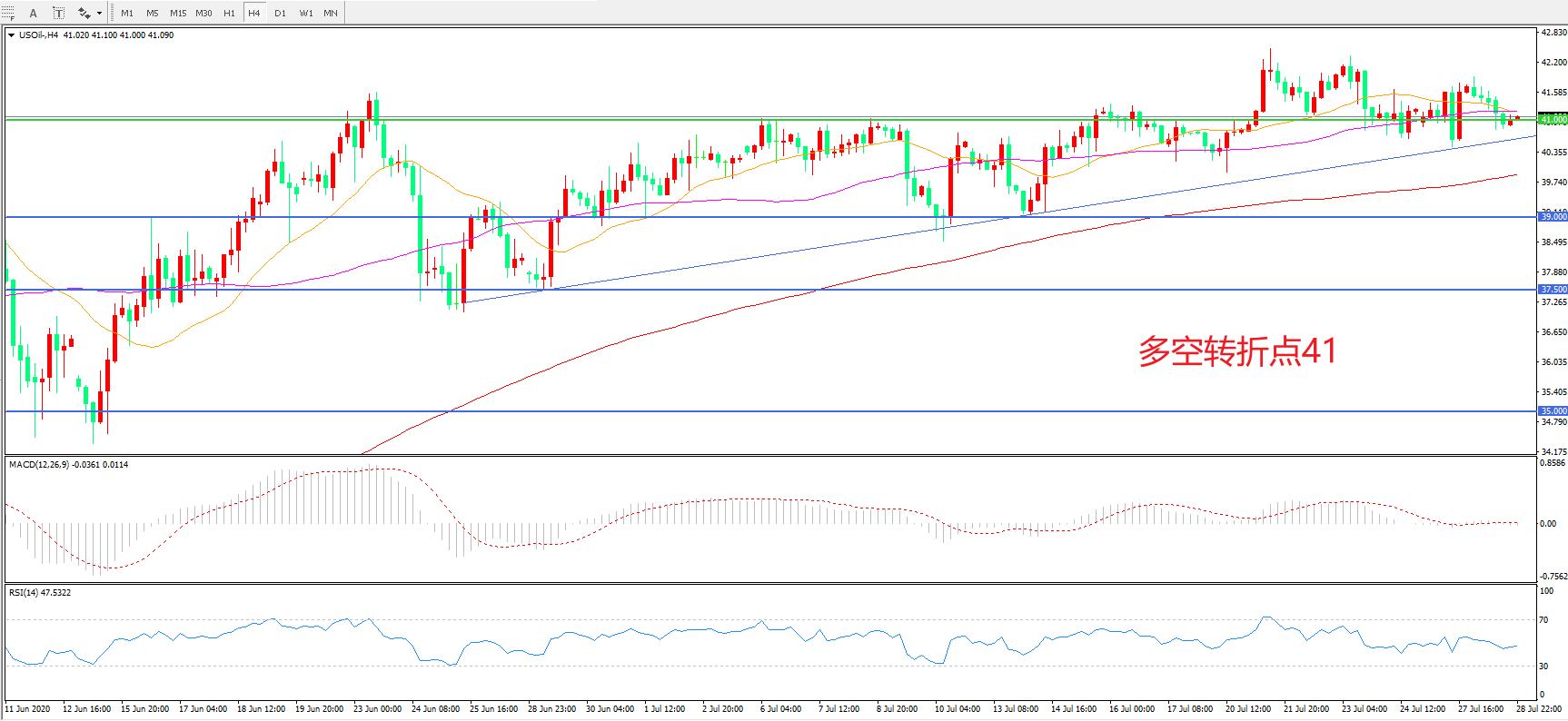 4小时图看,油价延续高位震荡,波幅逐渐收窄,41美元成为短期多空分水岭,MACD红柱增加,RSI指标走平,日内延续上行概率较大。