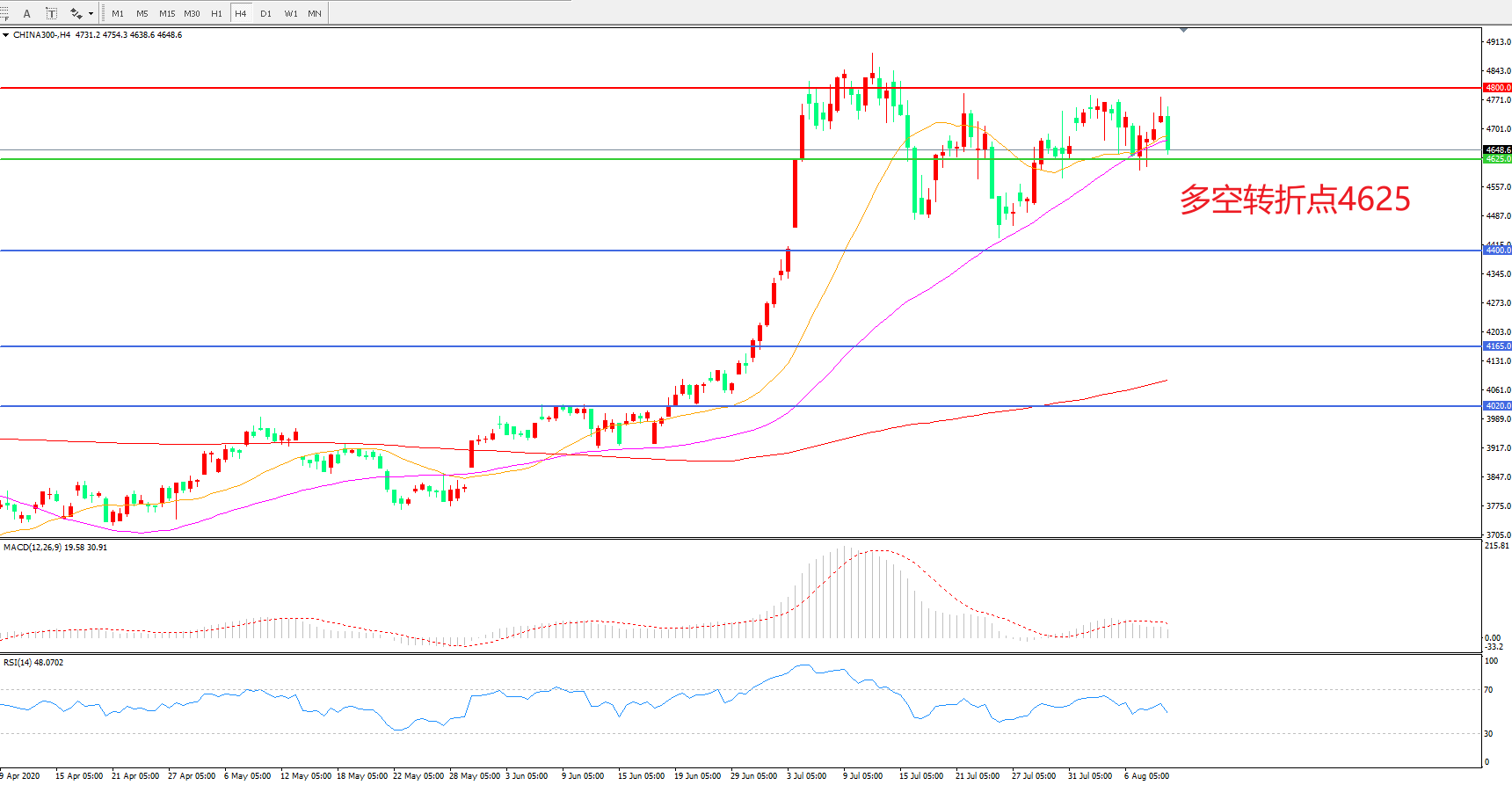 4小时图看,沪深300长阴下破,短期整体区间被跌破,但4625短期支撑仍在, 均线系统逐渐粘合, MACD红柱缩短,RSI指标向上,日内延续震荡概率较大。